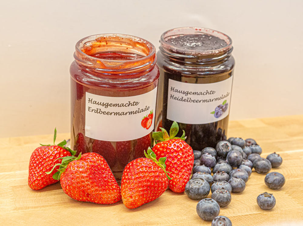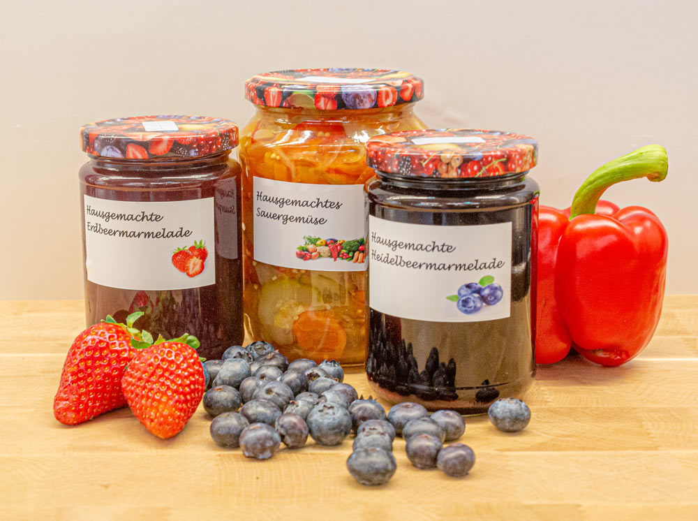 Finden Sie eine tolle Vielfalt an hausgemachten Marmeladen. Die verschiedenen Sorten werden in der jeweiligen Saison von uns eingekocht: